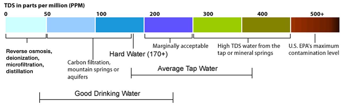 Water hardness is measured by the total dissolved solids (TDS). TDS refers to total dissolved solids which includes any minerals, salts, metals, and other chemicals dissolved in water. It is measured in milligrams per unit volume in grains per gallon (gpg) or parts per million (ppm).
