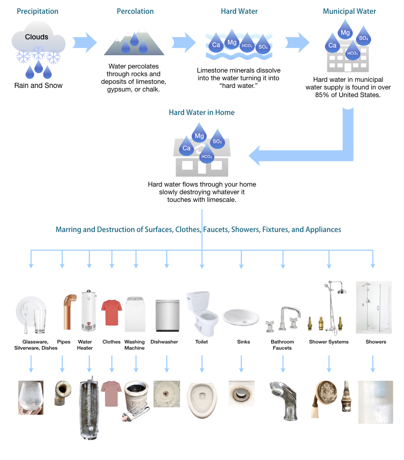 Hard water causes the buildup of scale in pipes, water heaters, and appliances — anything that water flows through or touches. It causes numerous problems in laundry, kitchen, and bath.