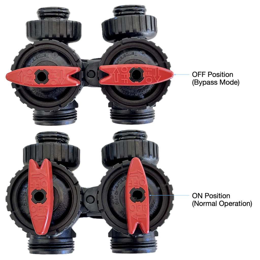 Notice the OFF and ON positions of the large red arrow handles of the Bypass Valves.