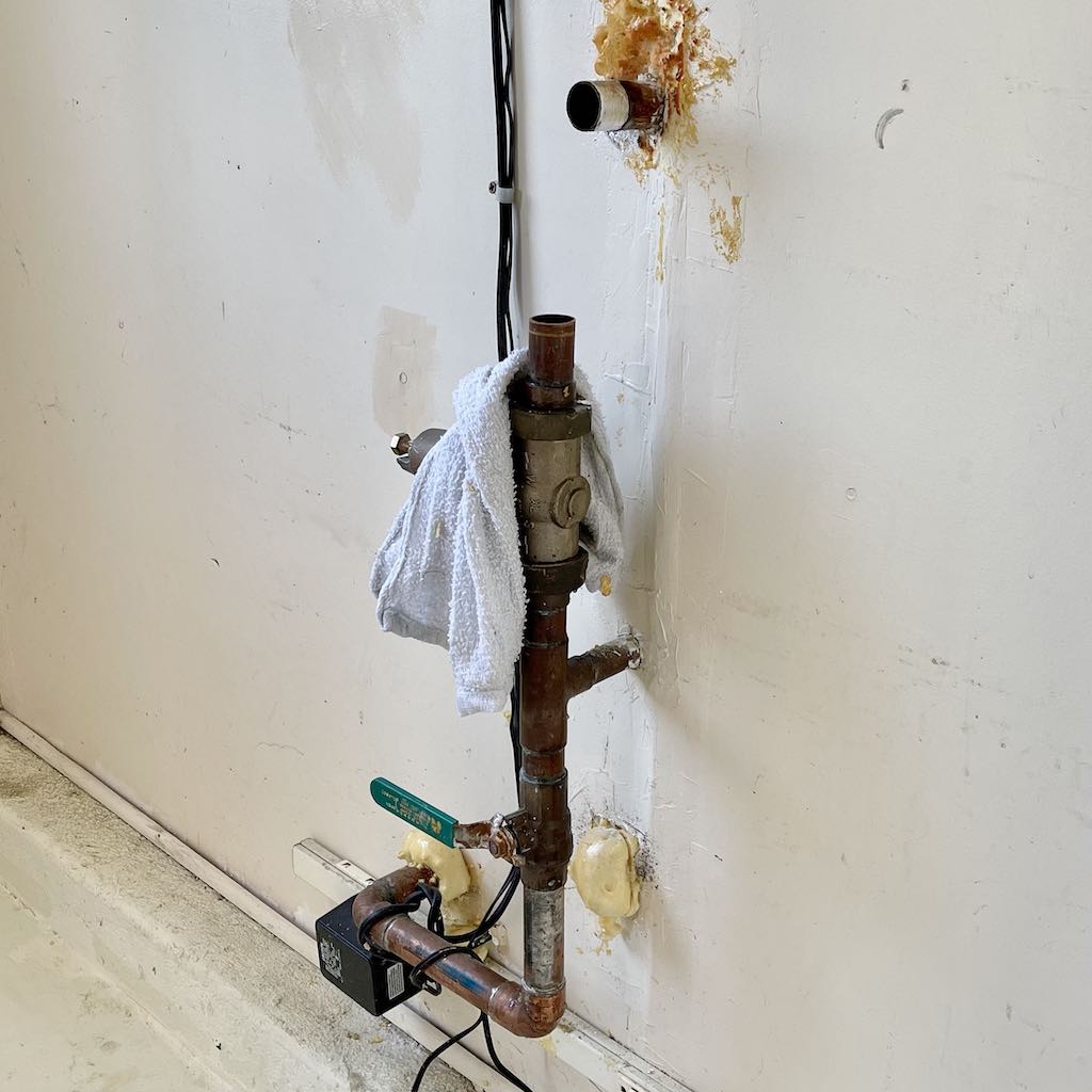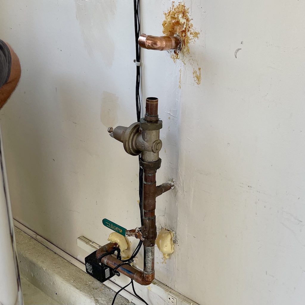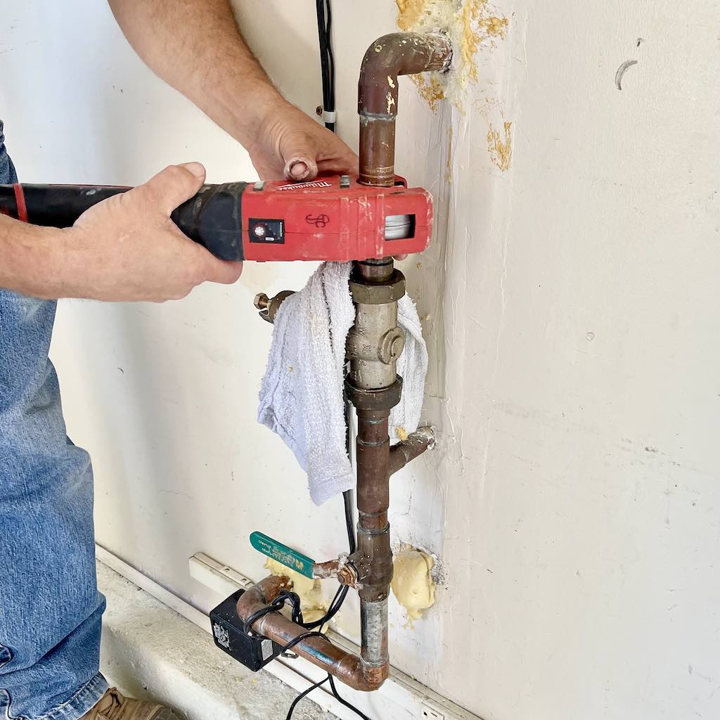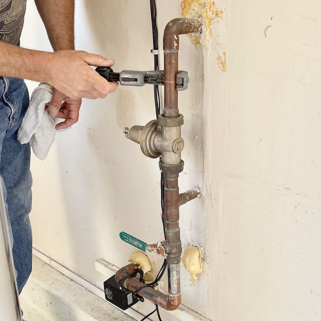 Use a cutting tool to cut the copper pipe above the water pressure regulator.