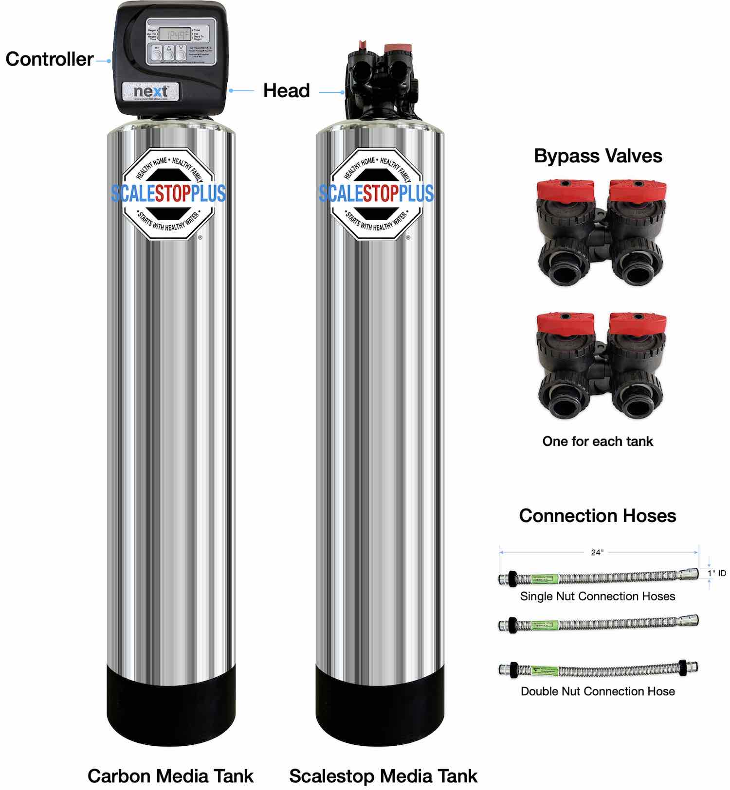 The ScaleStop Plus water filtration systems with dual tanks include the parts shown below.