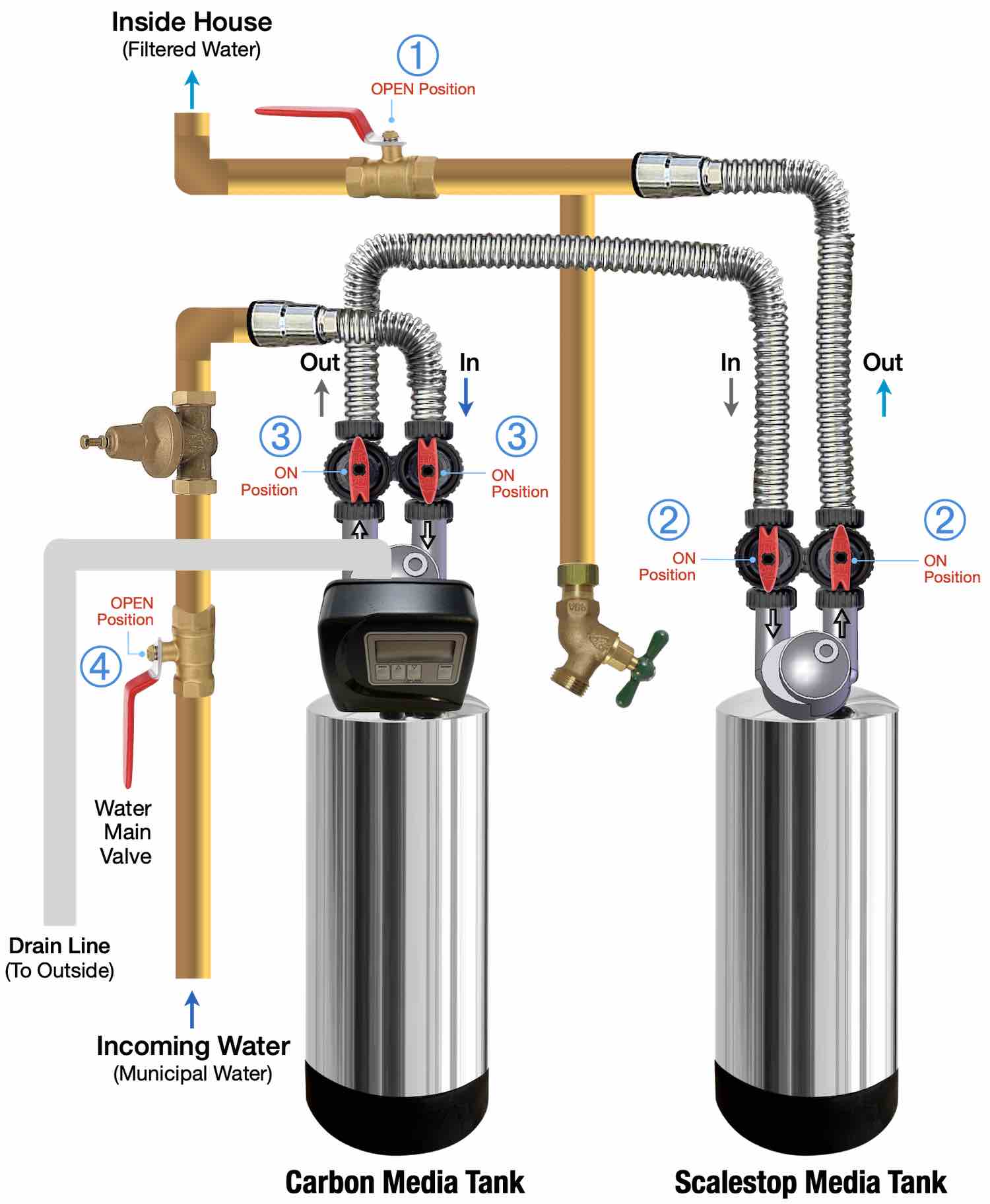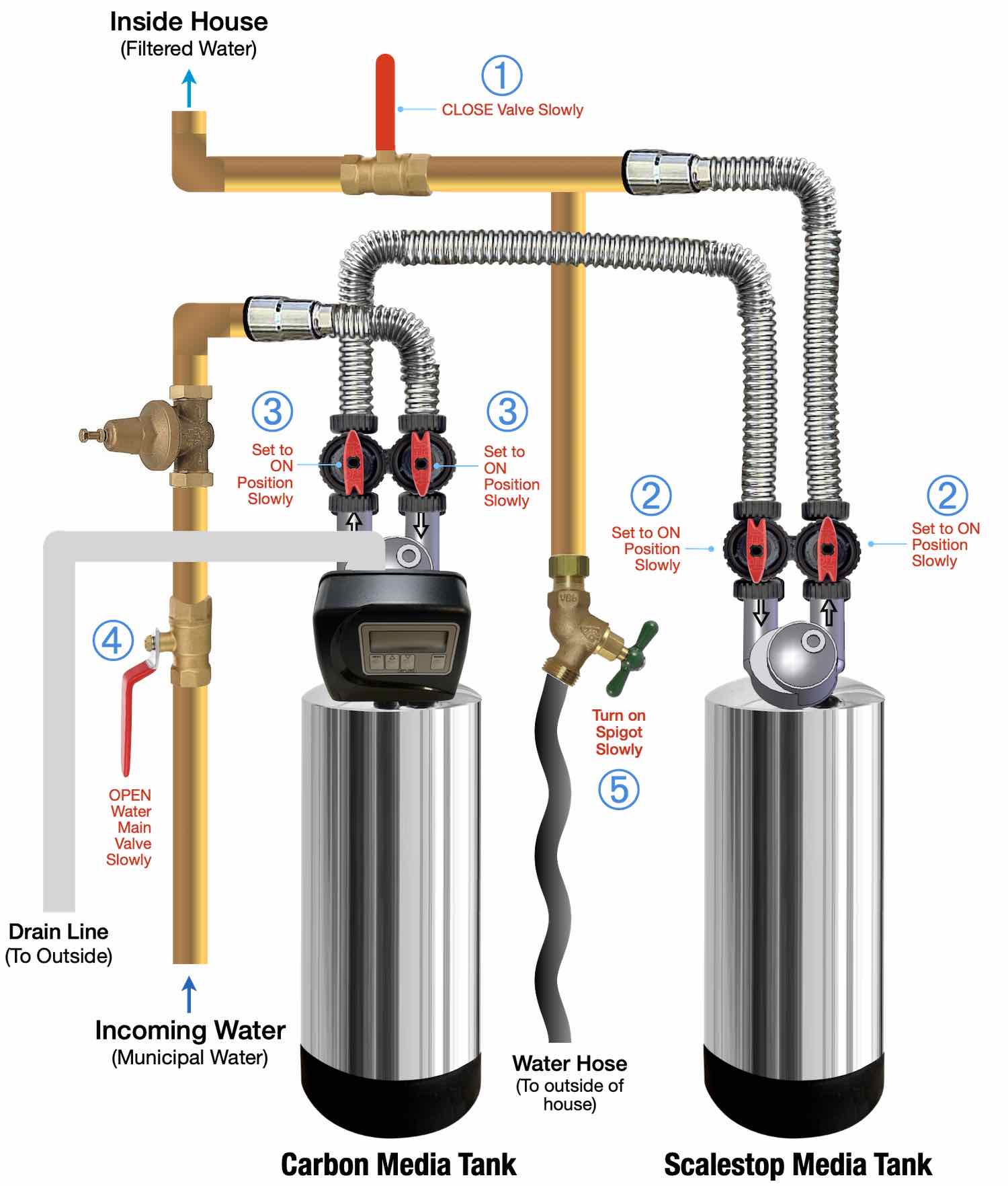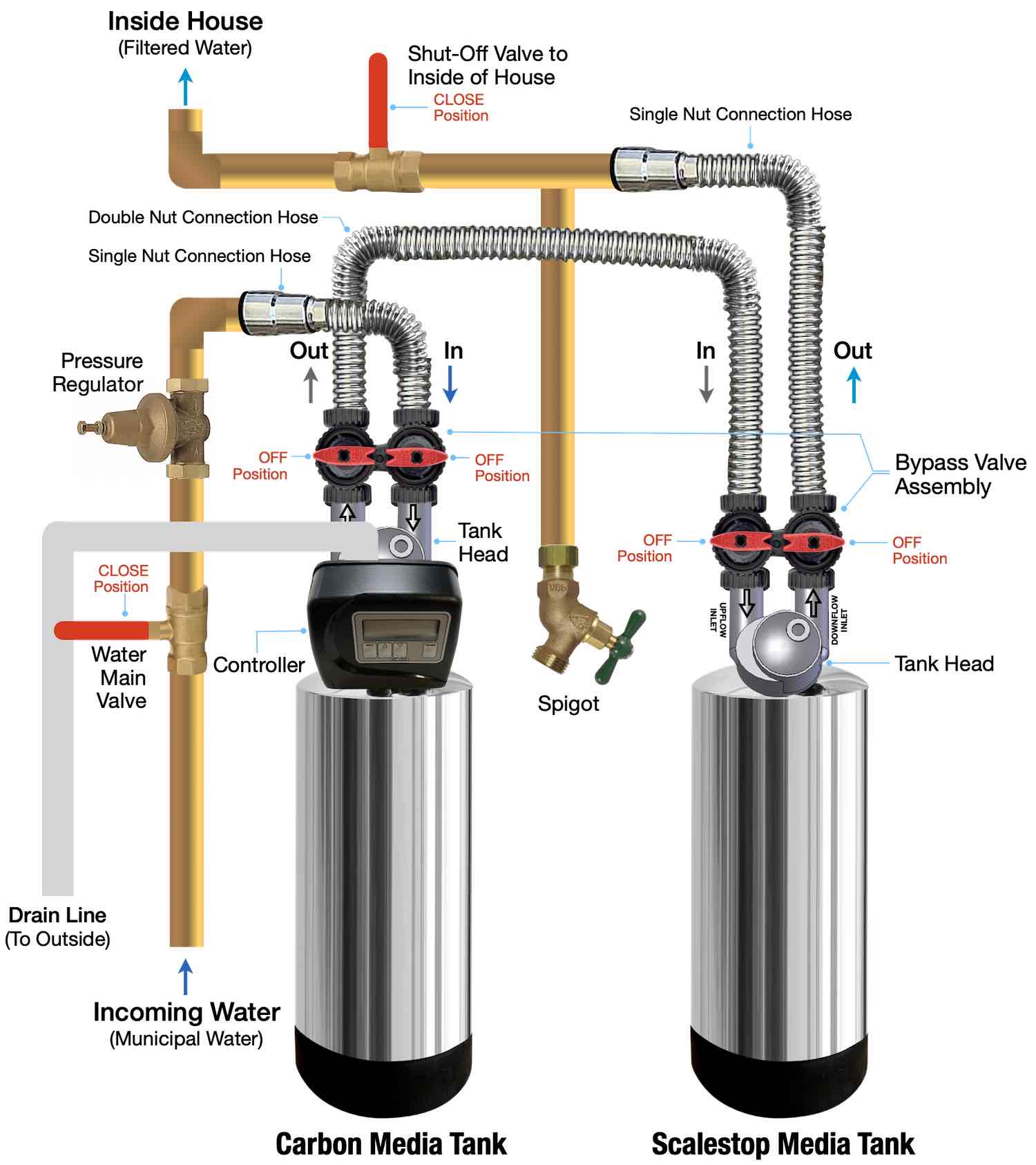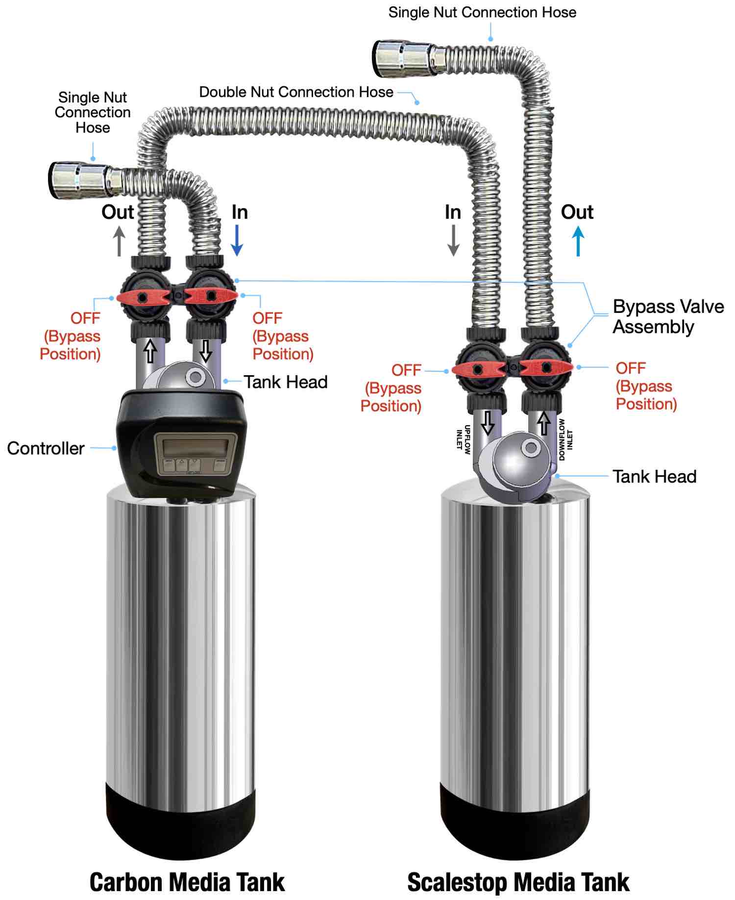⚠️ Caution All the connections are now completed, but the system is not yet operational. The Carbon Media Tank needs to be rinsed of manufacturing residue, the entire system needs to go through two or more regeneration cycles to adequately flush it, and the Bypass Valves need to be put in the open position.