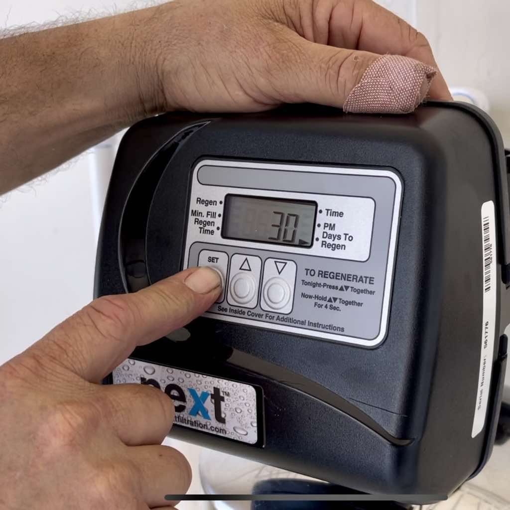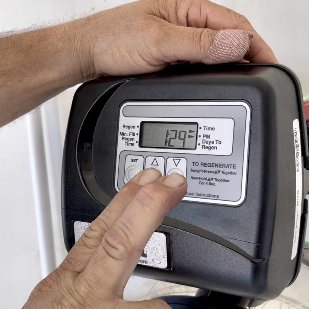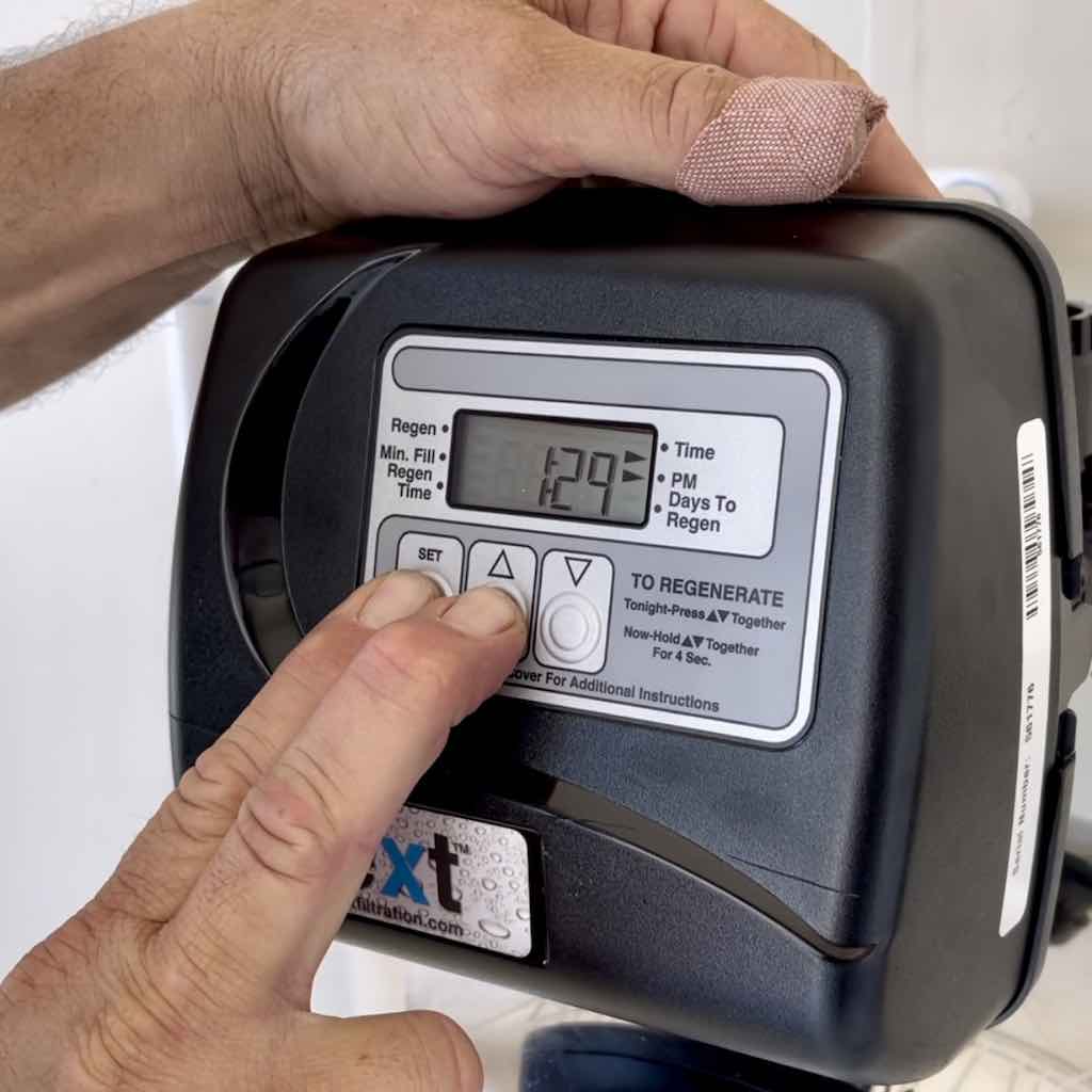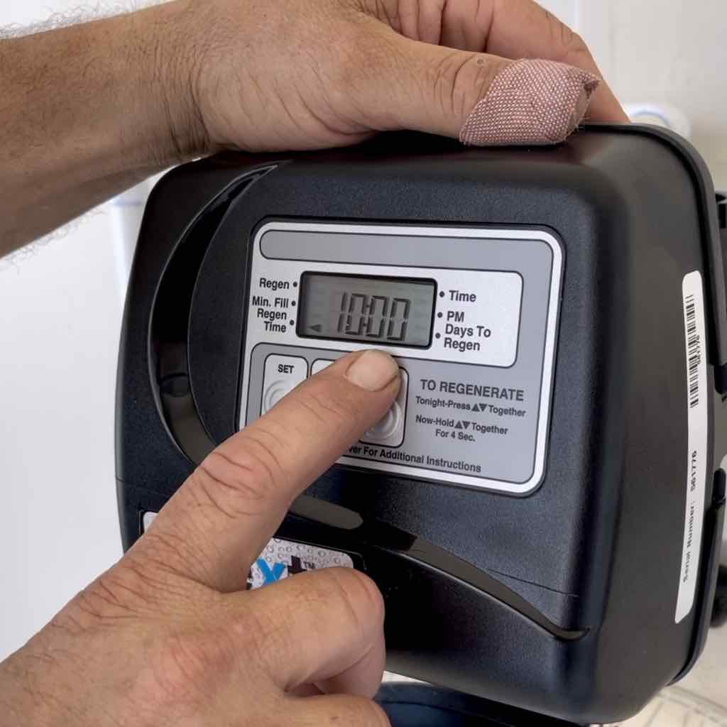 The Controller allows you to set the time and frequency of the monthly regeneration cycle. You will set the current time, then set the regeneration time to 10:00 AM, and the regeneration frequency to once every 30 days.