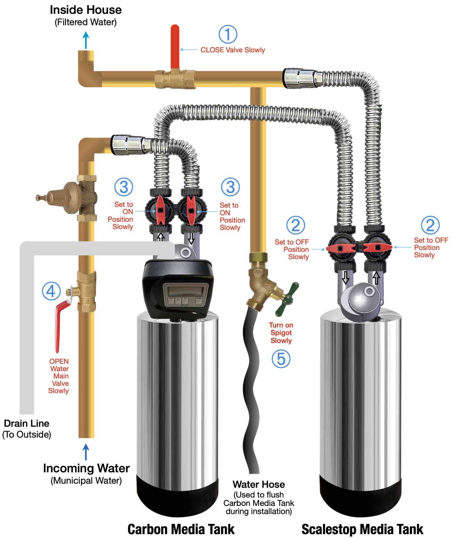 ⚠️ IMPORTANT Thoroughly flush the Carbon Media Tank during installation, to ensure all the residue from the carbon media manufacturing process is rinsed away.